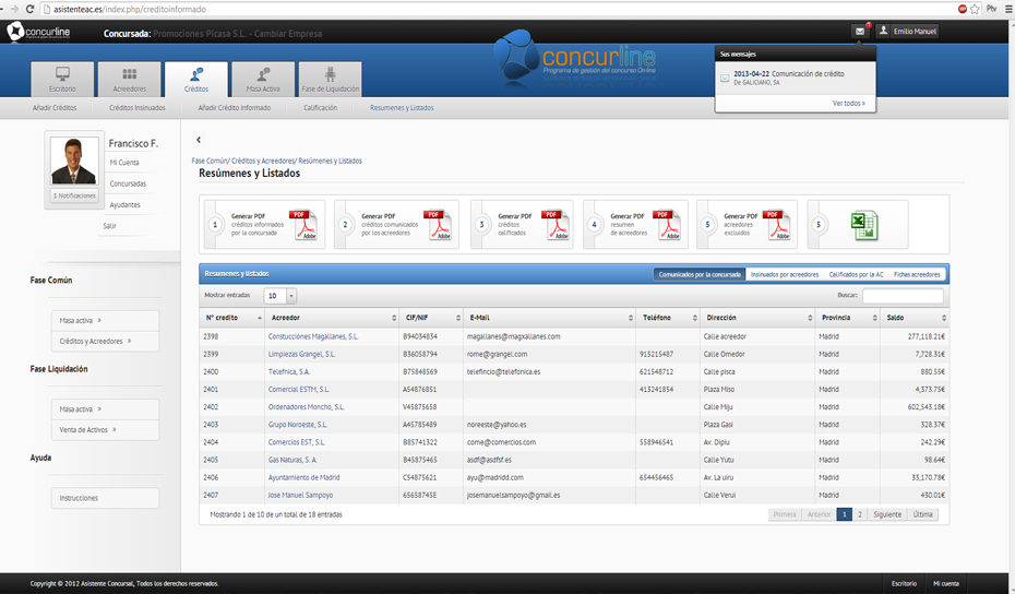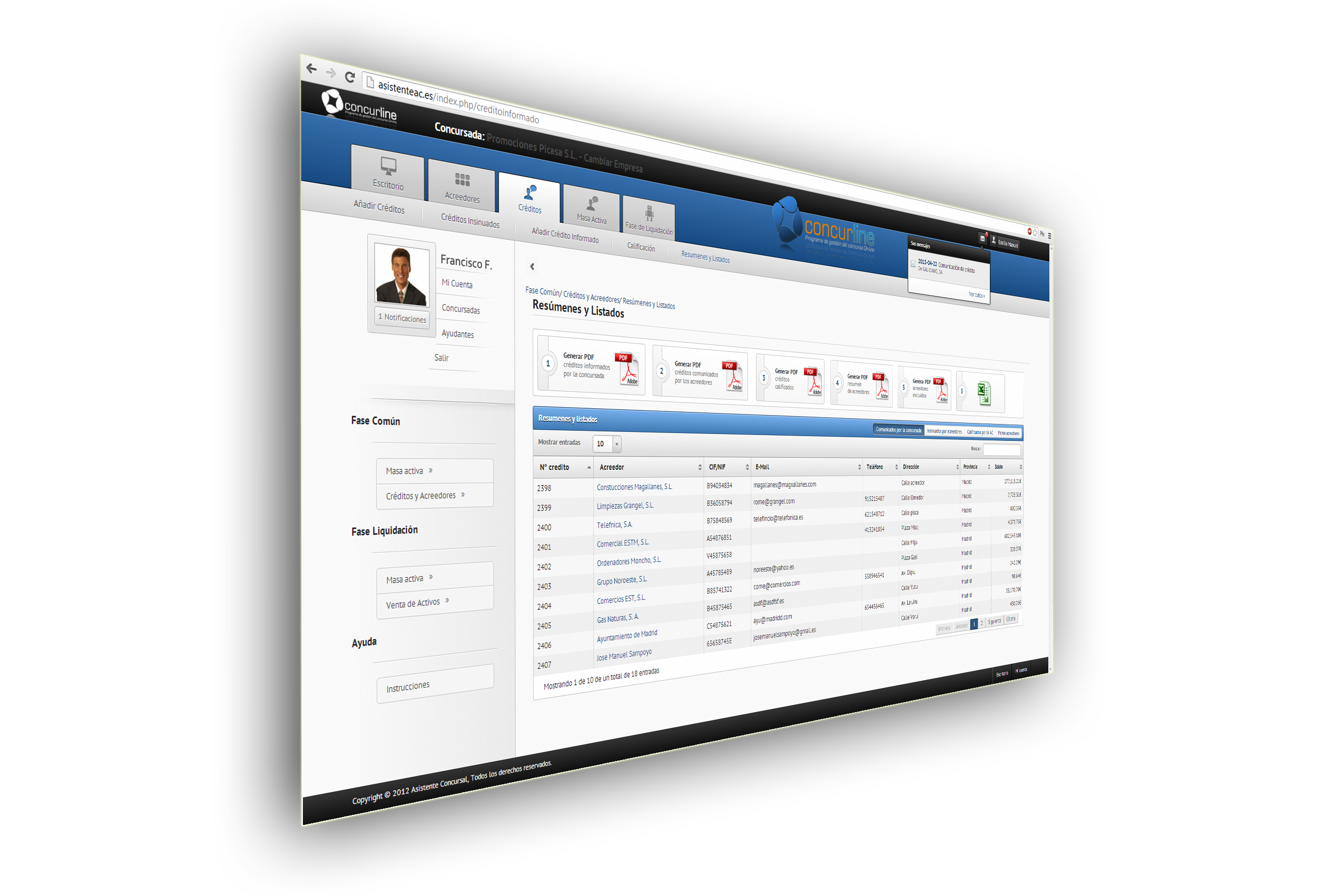 Programa para la gestión del concurso en su fase común: Convotatoria a acreedores, recepción de comunicaciones, calificación de créditos, generación de listados, inventario de la masa activa, ...