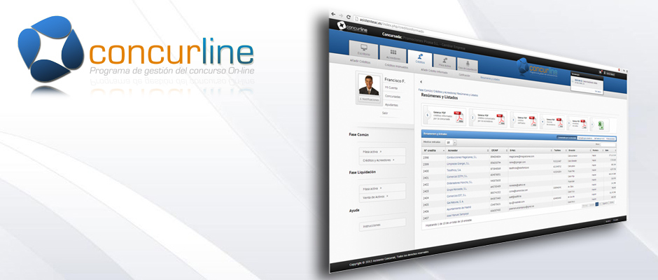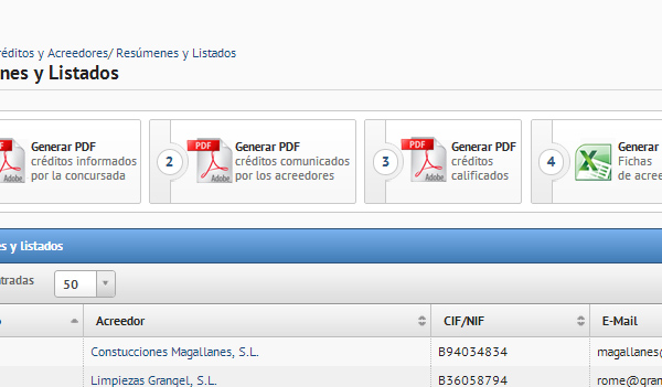 Concurline.com permite generar multitud de listados; Créditos según calificación, Acreedores por orden alfabéticos, Fichas de acreedores, Inventario de la Masa Activa, ...